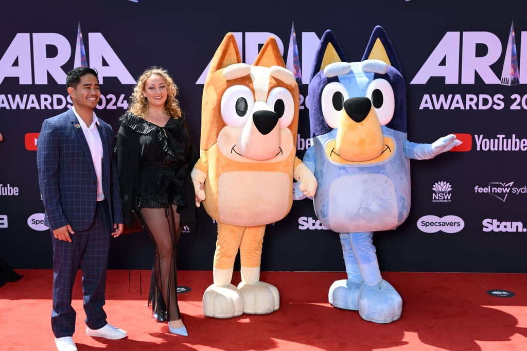 上个月,这部热门动画的主角布鲁伊和宾果"出席"了悉尼澳大利亚唱片工业协会音乐奖的红毯活动。图:EPA-EFE