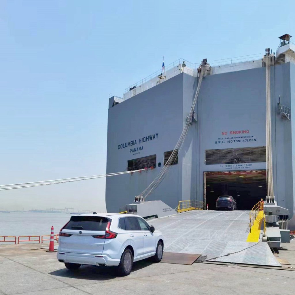 2023年5月23日,一辆由本田汽车与其中国合作伙伴东风汽车集团生产的本田CR-V混合动力汽车从上海启程前往比利时泽布吕赫港。照片来源:微博。