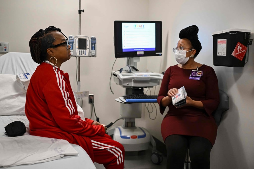 2024年12月11日,器官接受者托瓦娜·卢尼(左)在纽约大学朗格尼健康中心与一名护士交谈。照片:法新社