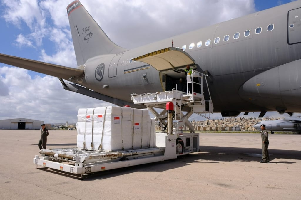 新加坡对加沙的人道主义援助于3月17日在约旦安曼从新加坡空军的多用途加油运输机上卸下。照片:新加坡国防部
