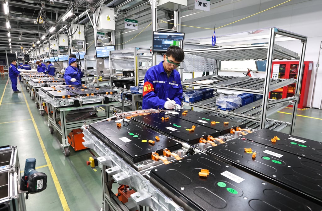 2023年2月,汽集团装配厂内工人正在安装电动汽车电池。图片来源:新华社