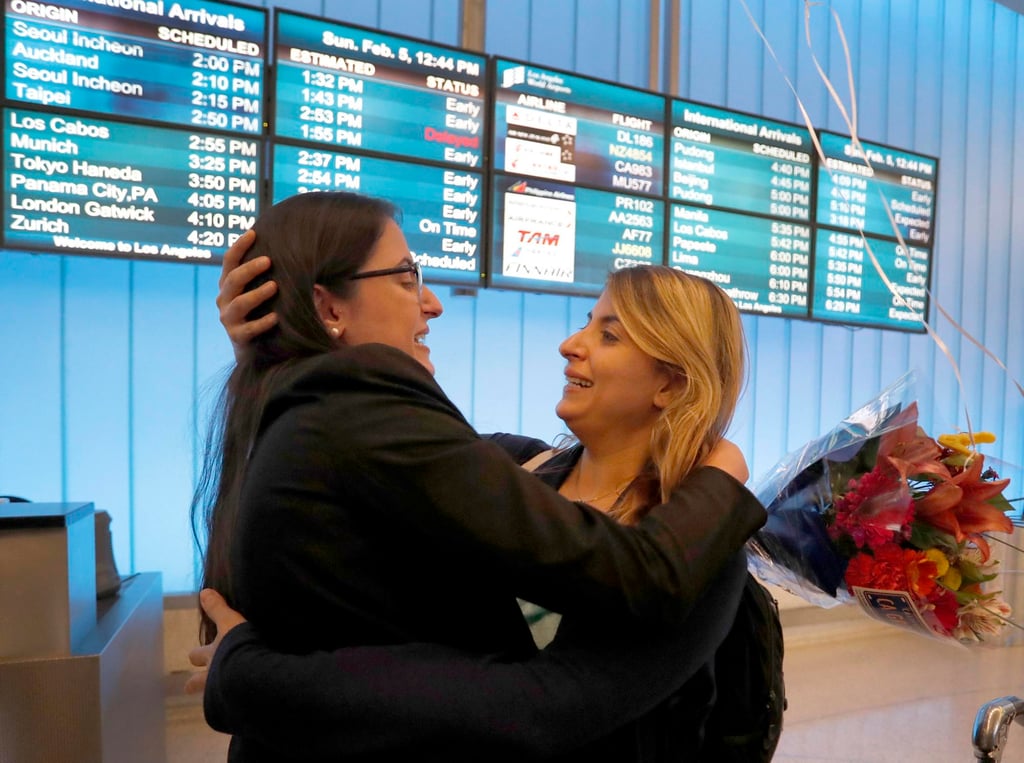 2017年2月,萨哈尔·亚尔贾尼·穆拉诺维奇(左)在洛杉矶迎接遭旅行禁令拘留23小时后抵达的妹妹——伊朗学生莎拉·亚尔贾尼。 图片来源:EPA