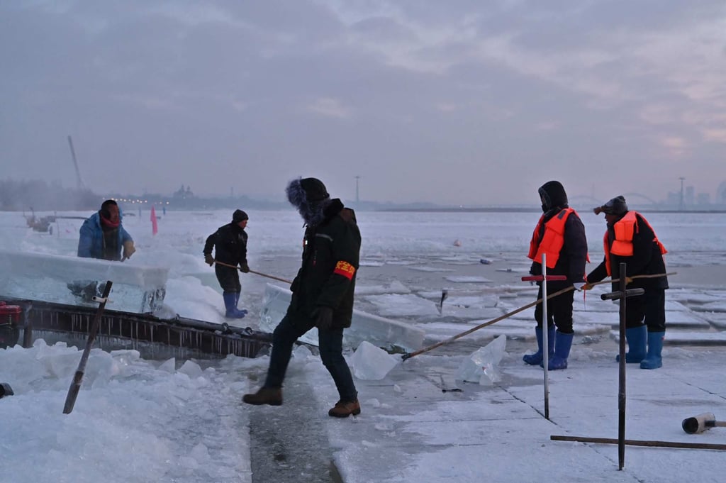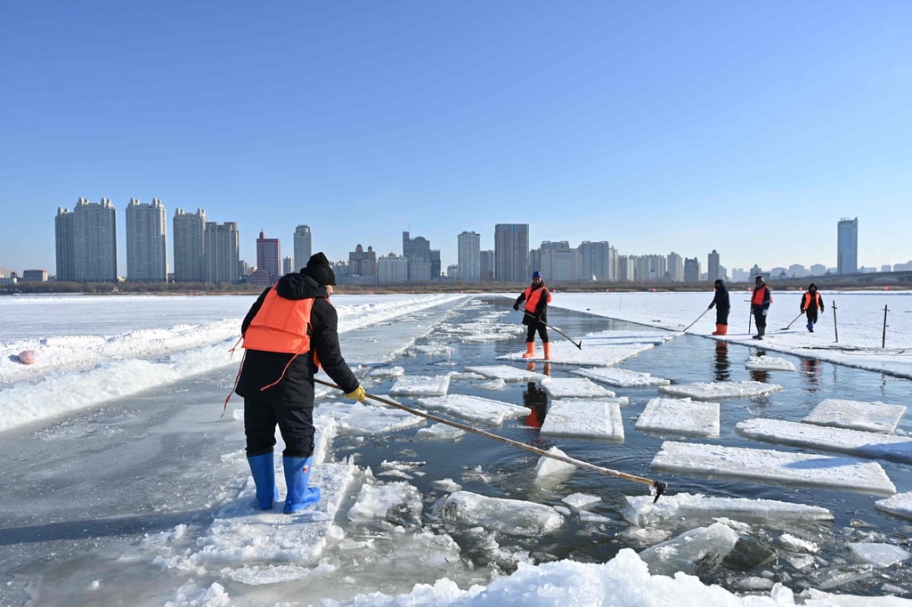 工人们在中国黑龙江省哈尔滨市的松花江上浮运冰块。图源:法新社