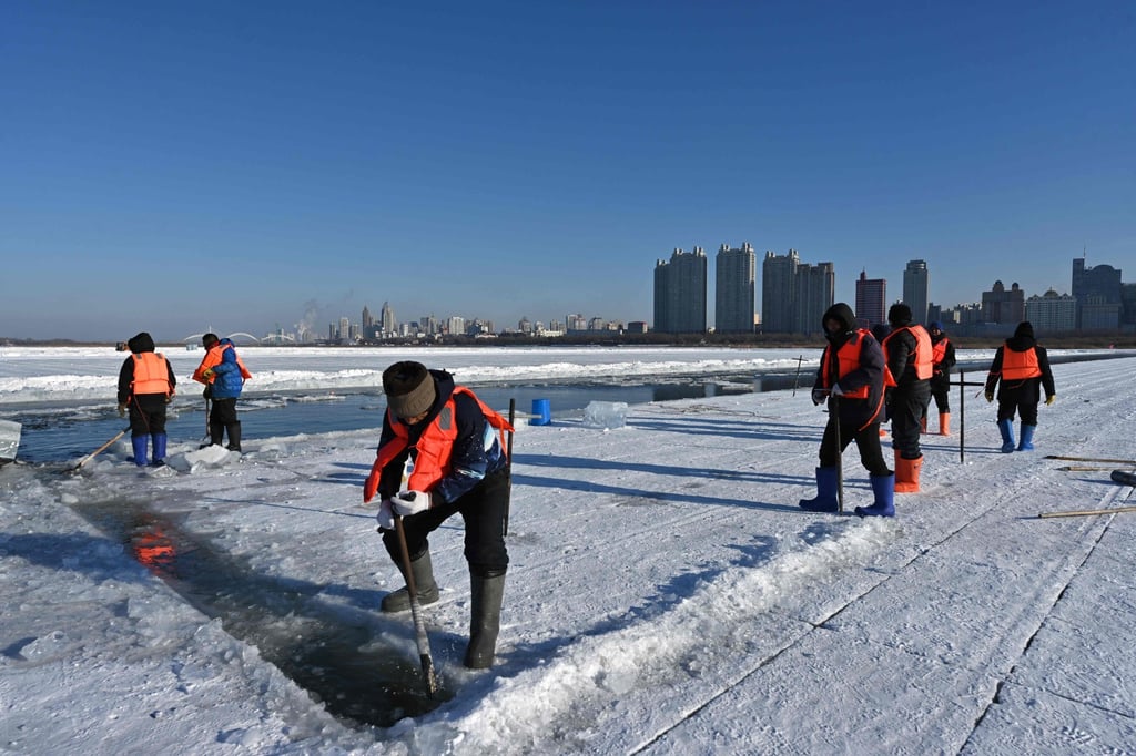 由于哈尔滨今秋气温偏高,工人们发现松花江冰层较薄。图源:法新社