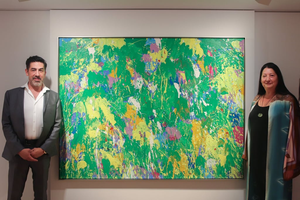 杰西·丁(左)与米娅·丁站在香港艺倡画廊,身旁是丁雄泉1967年作品《夏日交响曲(以贝多芬第四交响曲创作)》。摄影:艺倡画廊