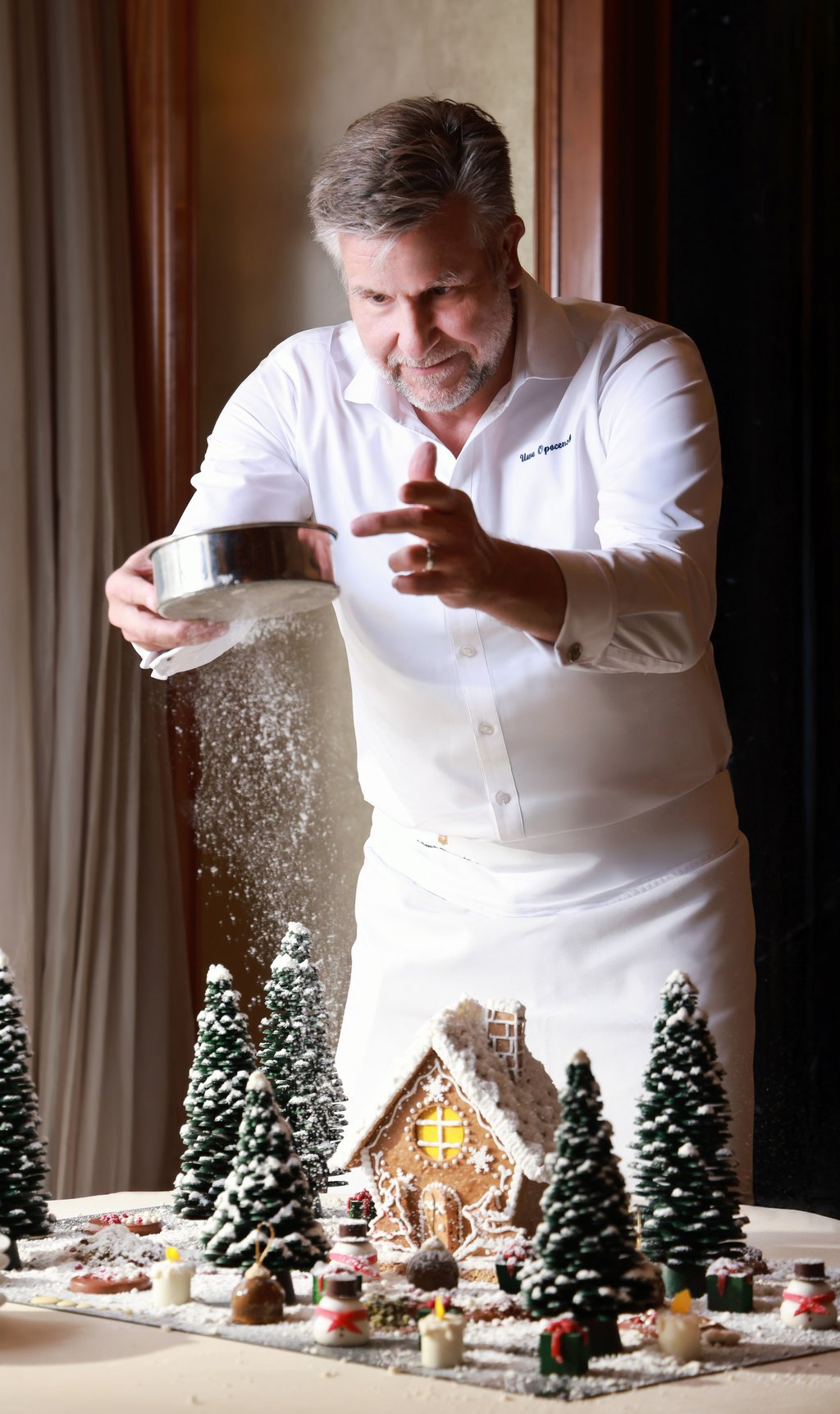 主厨乌韦·奥本康斯基正在为"冬日仙境"甜品做最后点缀。图片来源:珀翠餐厅