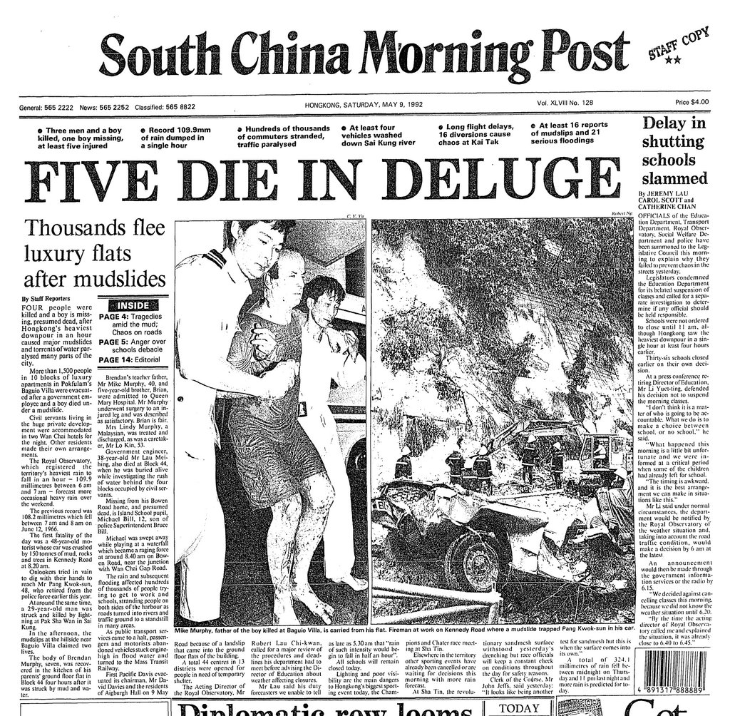1992年5月9日星期六《南华早报》头版报道了那场夺走五人生命的暴雨,这场灾难催生了新的风暴预警系统。照片:南华早报档案