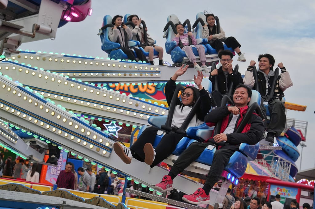 游客在中环海滨活动空间体验友邦嘉年华游乐设施。摄影:Elson Li