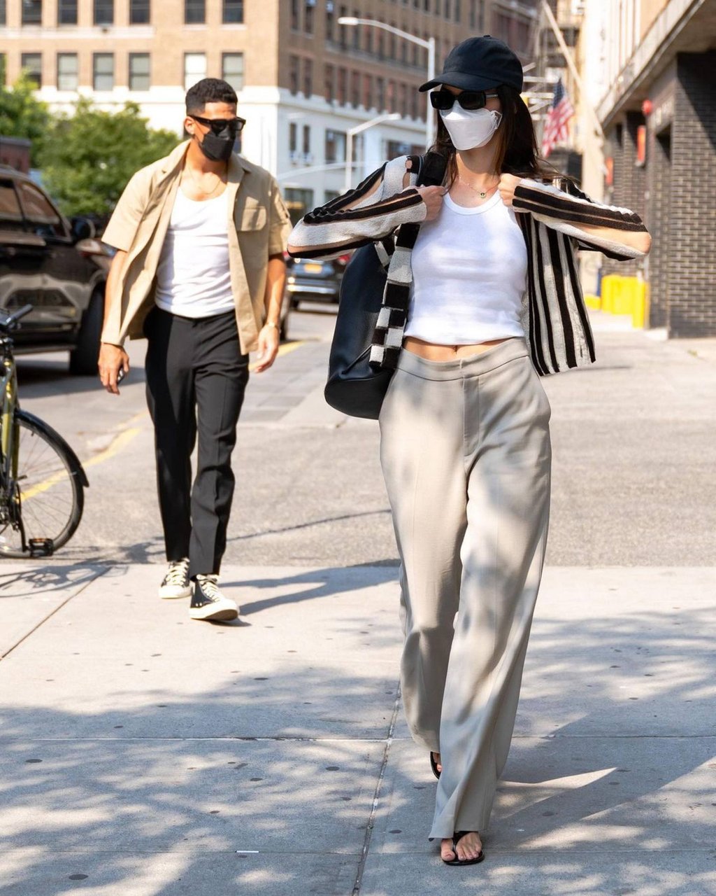 2021年9月,德文·布克身穿敞开的棕褐色衬衫和黑色长裤,与当时的女友肯达尔·詹娜合影。照片来源:@leaguefits/Instagram