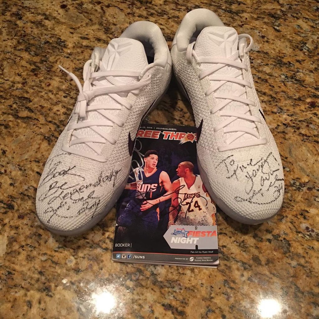 科比·布莱恩特亲笔签名并赠予德文·布克的球鞋,布克于2016年3月在Instagram分享。照片来源:@dbook/Instagram