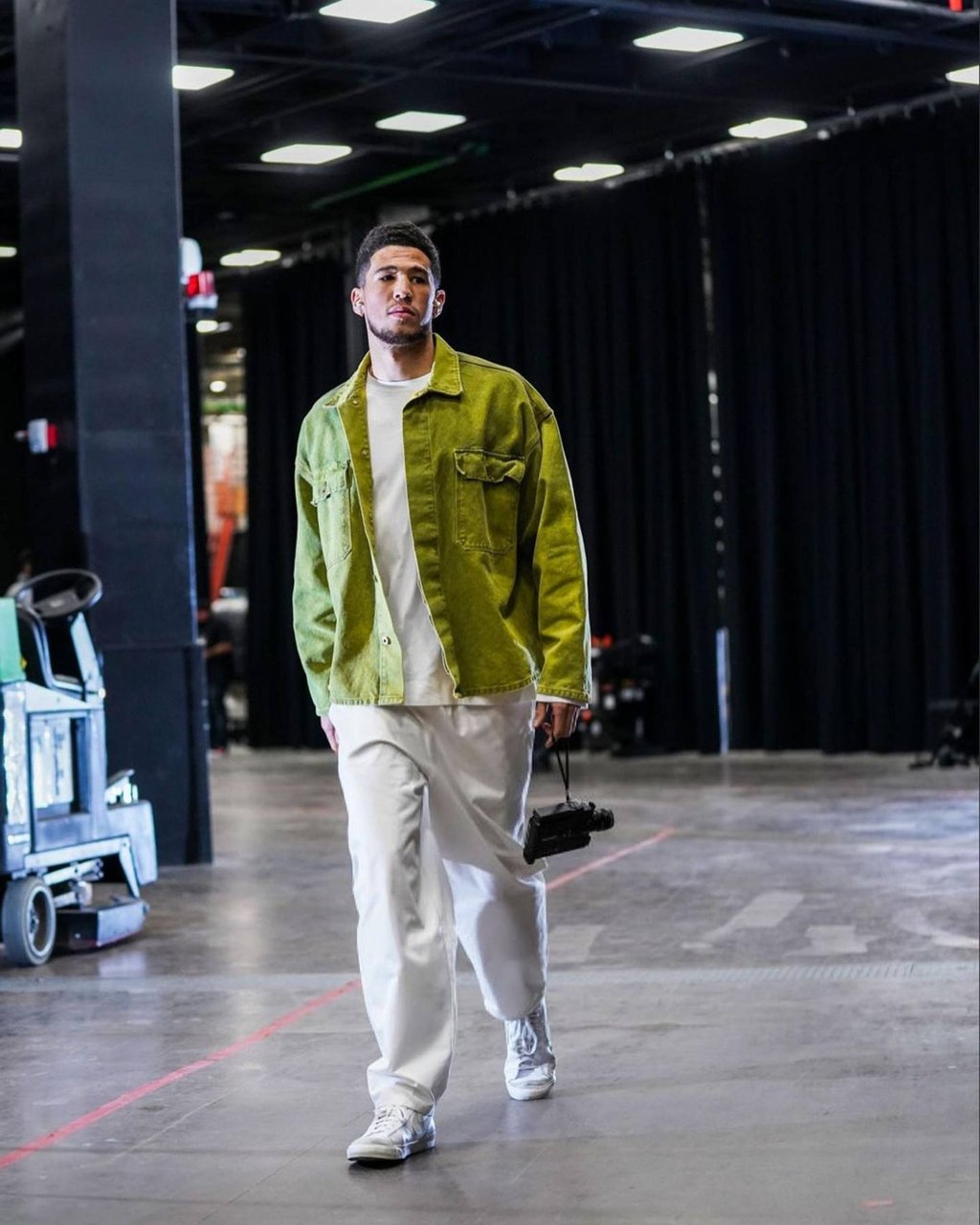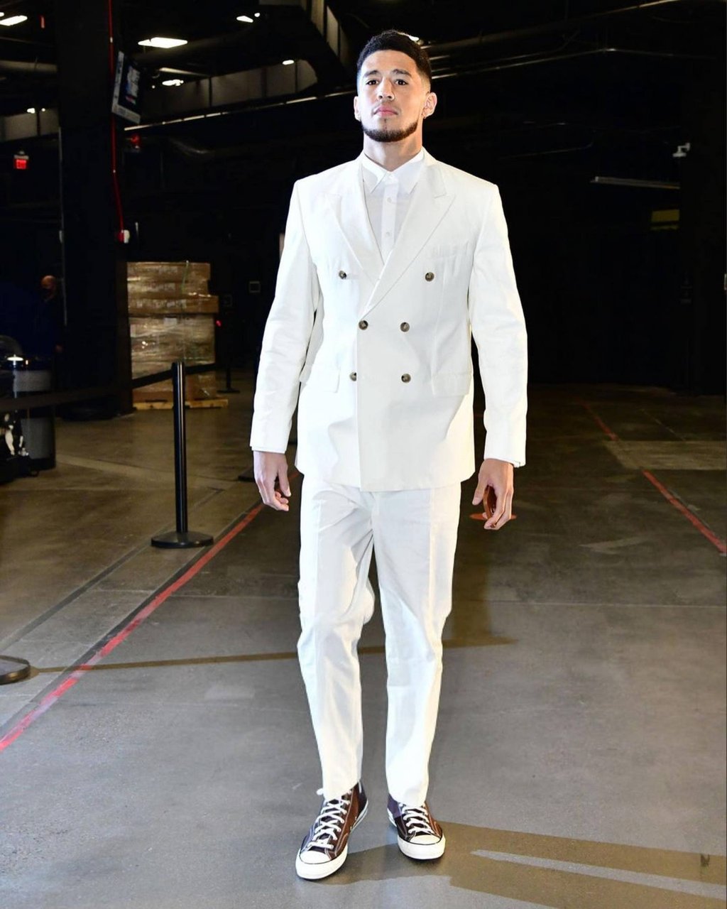 德文·布克身着白色西装搭配棕色运动鞋。照片来源:@dbooknations/Instagram