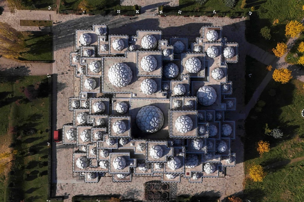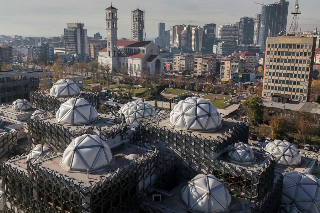 普里什蒂纳科索沃国立图书馆的穹顶。这座粗野主义石墙建筑覆以气泡状屋顶和网格钢架,成为城市地标。照片:法新社