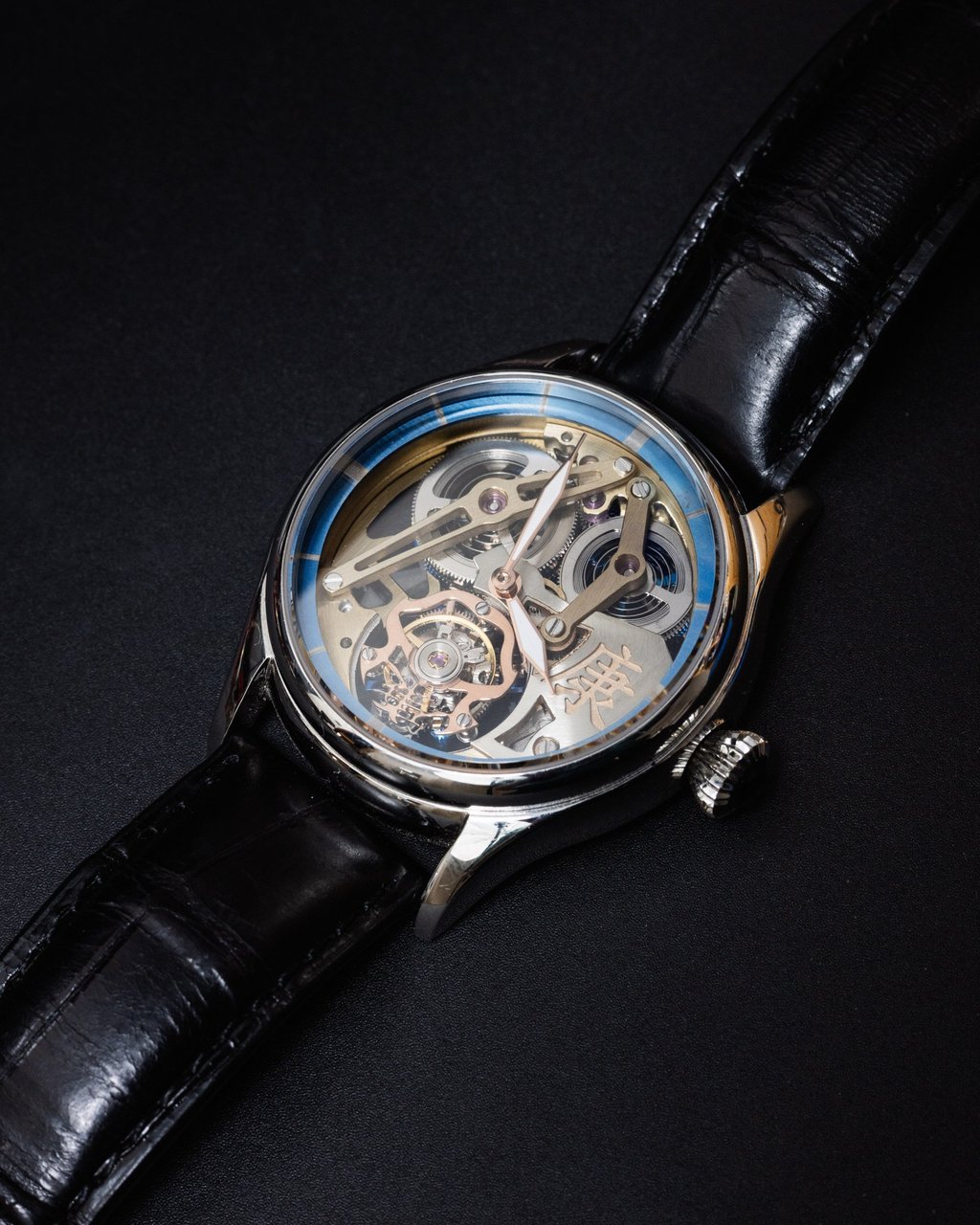 洪先生的最新作品以镂空陀飞轮为核心,展现了他创立个人品牌的终极理想。表盘三点钟位置饰以其中文姓氏的书法字样。他还用珠宝锯对原装机芯夹板进行切割,在十点钟位置手工打造了发条桥——这项精密工作中,哪怕毫厘之差都曾导致早期版本断裂。
