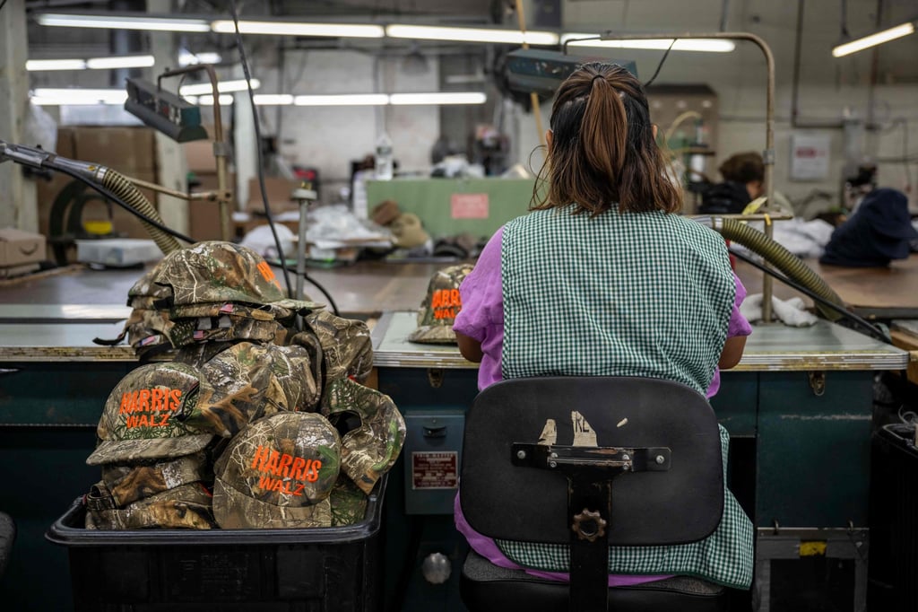 2024年新泽西州Unionwear工厂员工正在缝制贺锦丽与蒂姆·沃尔兹的竞选刺绣帽。图片来源:法新社