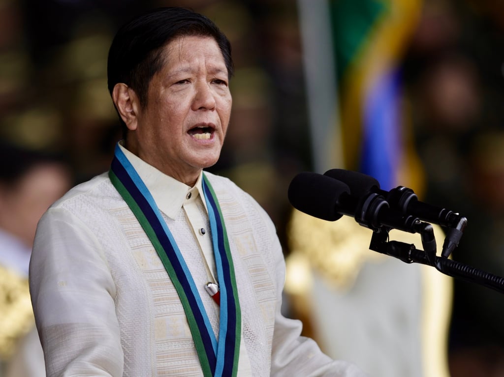 2023年12月20日,菲律宾总统小费迪南德·马科斯在大马尼拉奎松市阿吉纳尔多营举行的菲武装部队89周年纪念活动上发表讲话。EPA-EFE供图