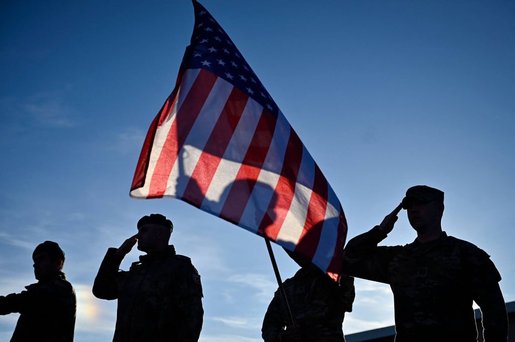 12月19日,保加利亚西北部莫克伦附近的新塞洛训练场,北约秘书长马克·吕特到访期间,北约多国战斗群中的美军士兵手持美国国旗列队。图片来源:法新社