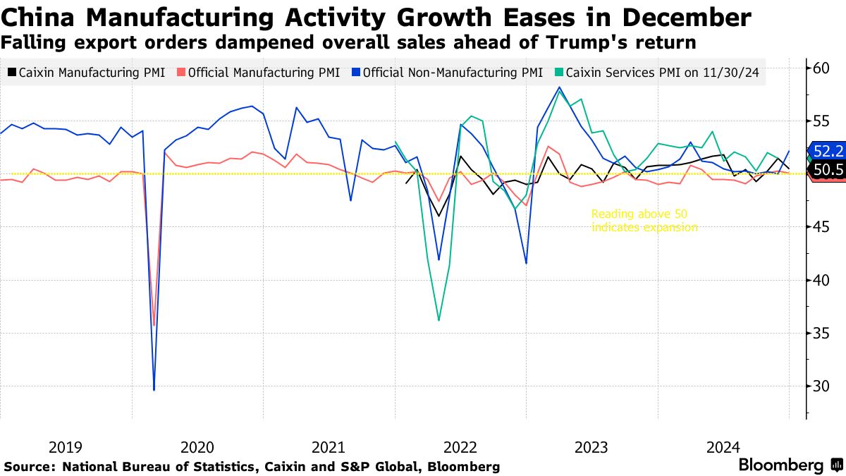 中国的制造业活动在12月份放缓了扩张的步伐,因为投资者在等待更多经济刺激措施,而唐纳德·特朗普——他威胁对中国出口征收关税——将重返白宫。