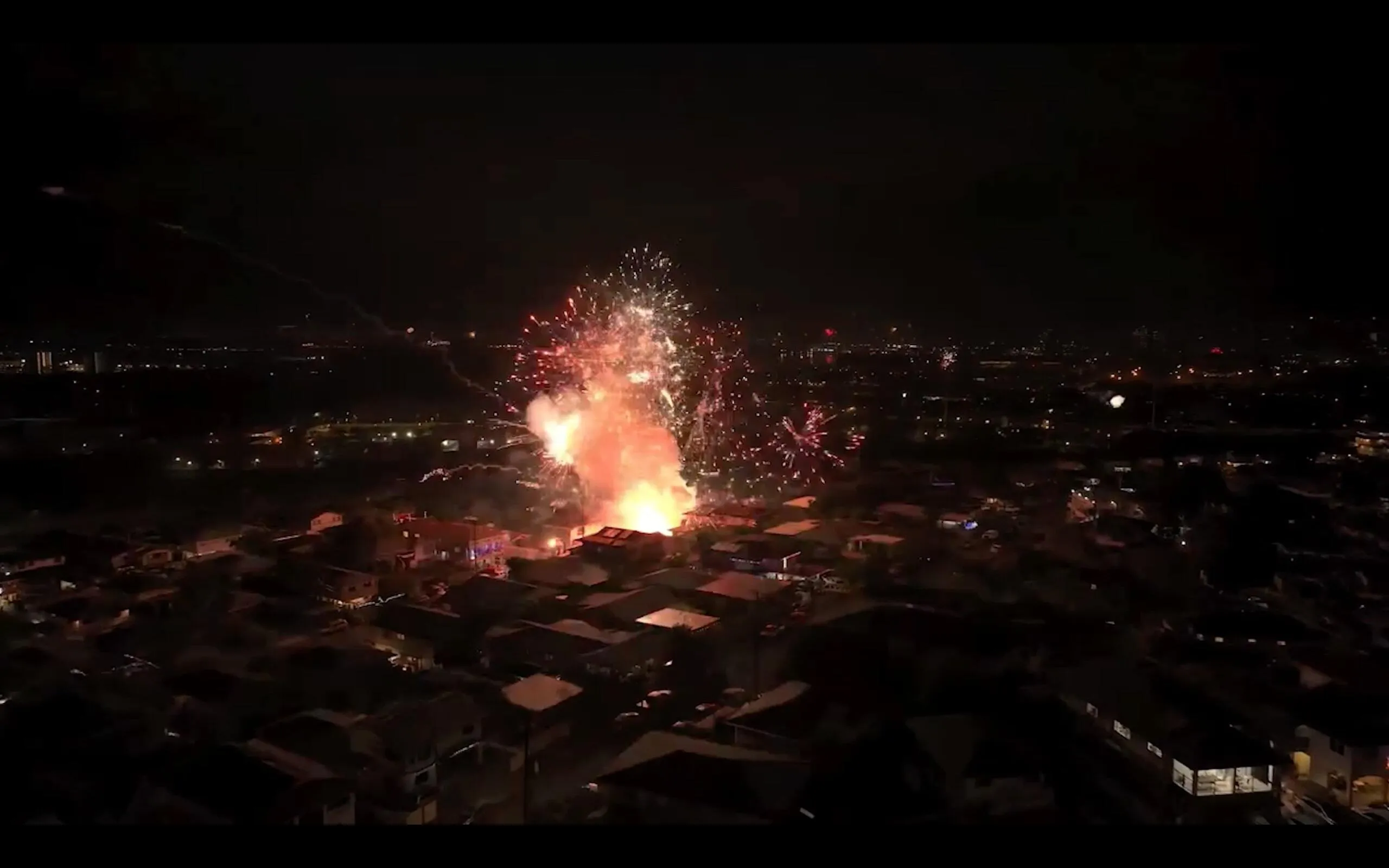 爆炸打破了对面街道的窗户。爆炸发生时,一捆点燃的空中烟花(称为“蛋糕”)倾倒或从桌子上掉落,横向发射到装有额外烟花的箱子中,随后发生了爆炸。
