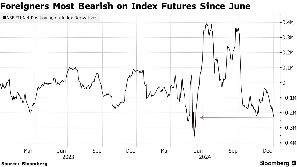 根据彭博社汇编的数据,周三海外投资者对Nifty期货的看空押注是自去年6月以来的最高水平。