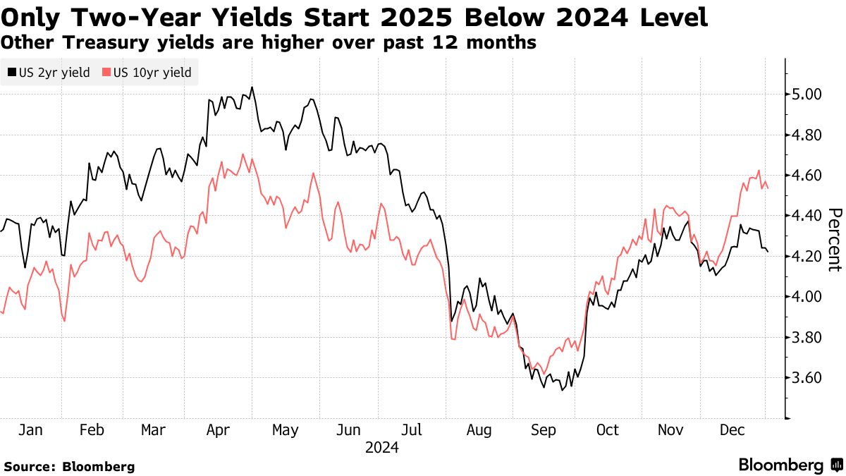 “除了两年期票据外,我们预计2025年国债曲线的其余部分将保持在4%以上,”MUFG证券美洲公司美国宏观策略负责人乔治·冈萨尔维斯表示。“鹰派的美联储、财政政策的不确定性以及普遍增加的供应将使10年期收益率在未来一年保持高位。”