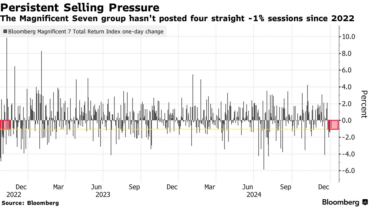 这可能解释了为什么投资者对该集团越来越谨慎。 彭博七大奇迹总回报指数 正在迎来连续第四个交易日下跌至少 1%,这是自 2022 年以来最长的此类下跌趋势。该指数从未出现过连续五天下跌 1% 或更多的情况。