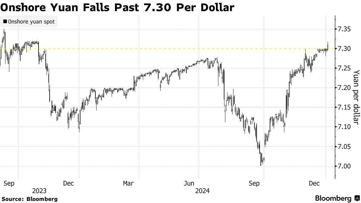 人民币首次突破每美元7.3的心理关口,这是自2023年底以来的首次,因市场对中国经济困境的担忧以及与美国的债券收益率差距扩大。尽管中央银行在周五维持了对该货币的支持,但这一举动仍然发生。