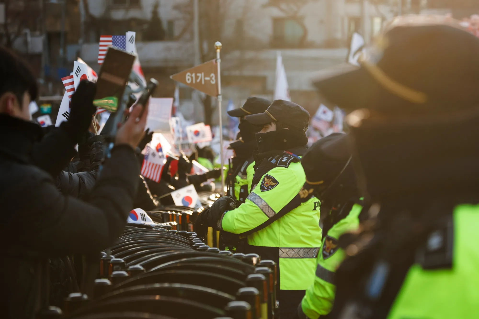 警察在守卫,支持韩国总统尹锡悦的支持者在首尔总统官邸附近聚集,时间是星期五。