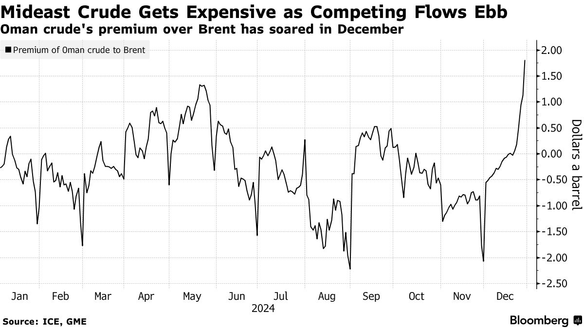 阿曼和迪拜原油价格飙升至布伦特原油的罕见溢价,而穆尔班期货在年末的最后两个月表现优于全球基准。由于中国和印度的需求增加,以及像 TotalEnergies SE 这样的公司在所谓的普氏窗口上积极竞标,价格上涨,交易员表示。