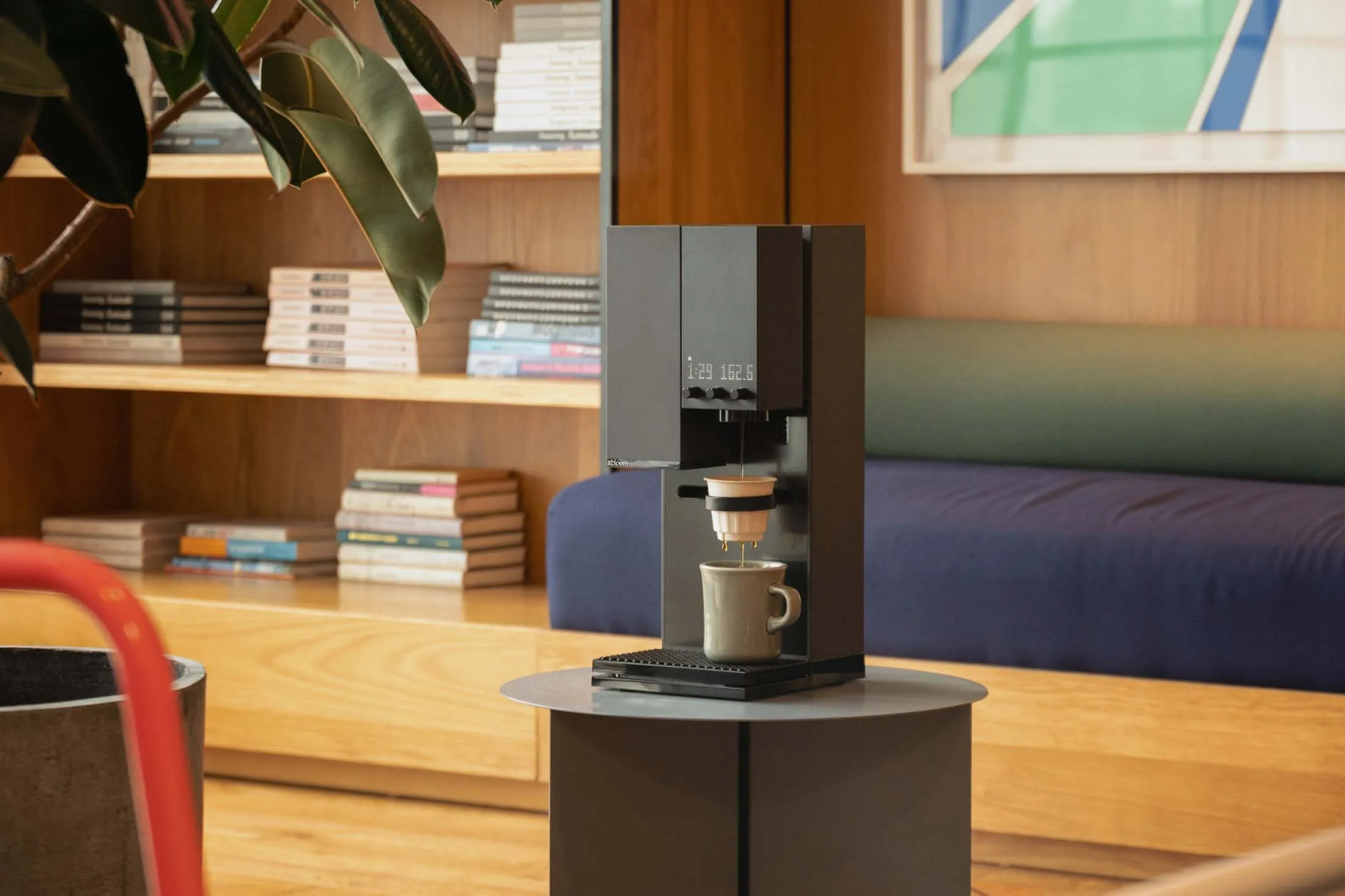 使用这台机器的最简单方法是购买xBloom的单杯装、充满整豆的胶囊,其中大多数由一系列小型独立烘焙师制作,如Onyx Coffee Lab和Proud Mary。每包都附有一张嵌入RFID(射频识别)的卡片,包含咖啡的详细信息。将卡片触碰到机器顶部,它会将Studio设置为烘焙师的配方。将咖啡豆倒入研磨机,将空胶囊(同时作为滤网)放入其支架中,然后按下开始。48毫米的锥形磨刀研磨机会根据偏好的大小和速度进行调整,水以编程的速率和温度流出。在倒入之间,手臂甚至可能会振动,以搅动咖啡以获得更好的萃取。