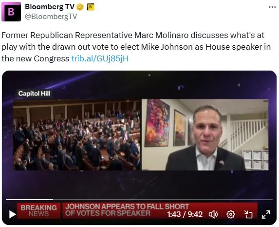 今天在彭博电视台的 权力平衡 早间版中,主持人乔·马修和凯莉·莱因兹采访了前共和党代表马克·莫利纳罗,讨论众议院议长选举。