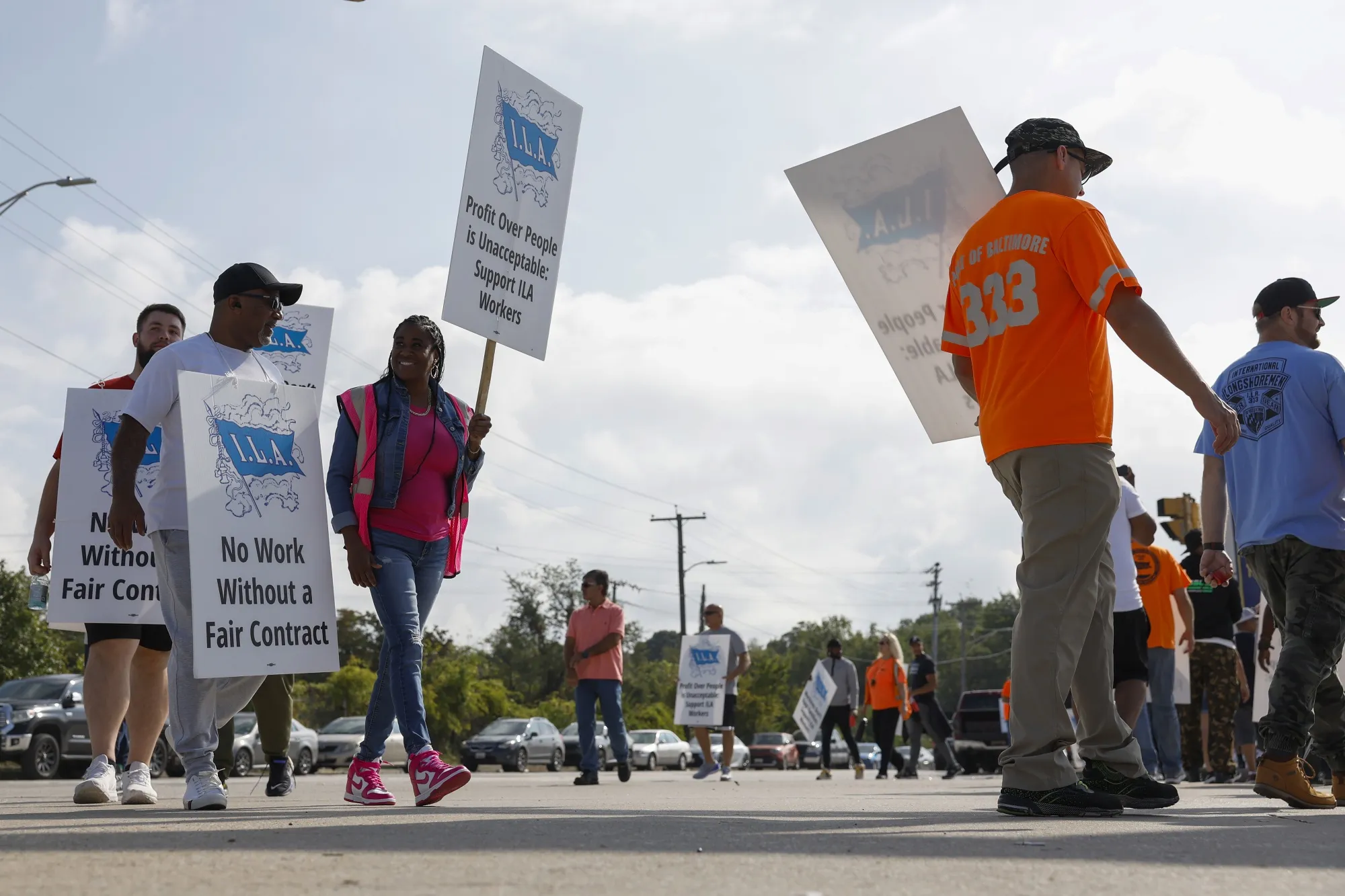 巴尔的摩,马里兰州 - 2024年10月03日:国际码头工人协会(ILA)的码头工人与他们的支持者在巴尔的摩港的邓道克海洋码头入口外抗议。东海岸和墨西哥湾地区36个主要港口的码头工人在本周早些时候罢工,开启了自1977年以来ILA的第一次全国性罢工,因为工会未能与港口所有者达成合同协议。(照片由安娜·莫尼梅克/盖蒂图片社提供)摄影师:安娜·莫尼梅克/盖蒂图片社北美欢迎回到 预测,在这里我们帮助你思考未来——从下周到下个十年——提供预测和分析。