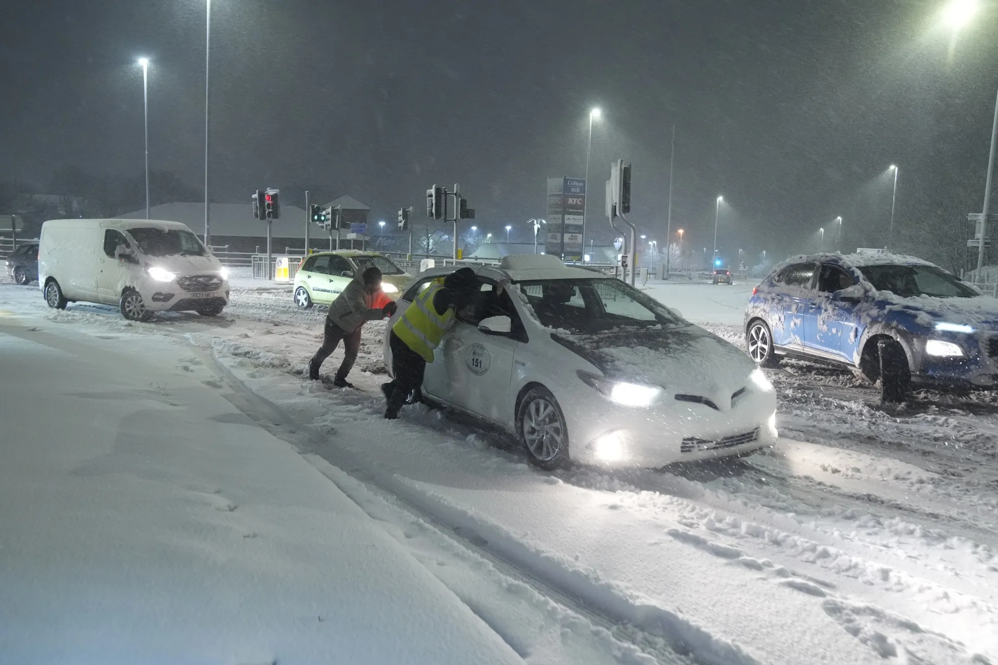 人们在利兹帮助推动车辆,车辆被困在雪中,1月5日。