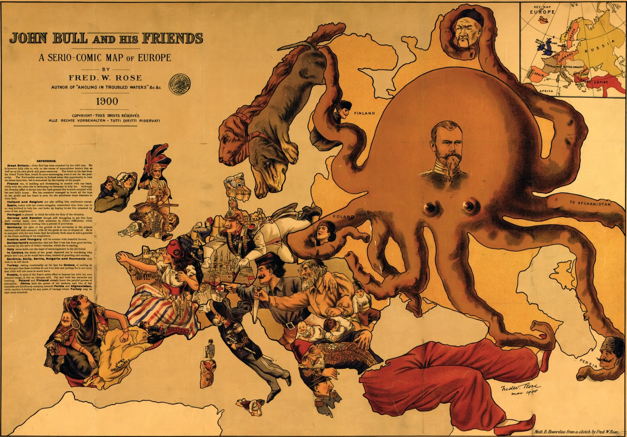 1900年欧洲政治关系的漫画,显示俄罗斯帝国如同一只触手伸向亚洲、法国和西班牙的章鱼。插图由弗雷德里克·W·罗斯绘制。来源:Buyenlarg via Getty Images如果这样的力量主导了欧亚——世界上最大的陆地,三分之二的人口和大部分工业力量当时都居住在这里——他们将拥有资源和指挥战略位置,足以危及全球各国。正如麦金德所说,“欧亚内部权力平衡的颠覆”将危及到各地的自由,因为“世界的帝国将会显现。”