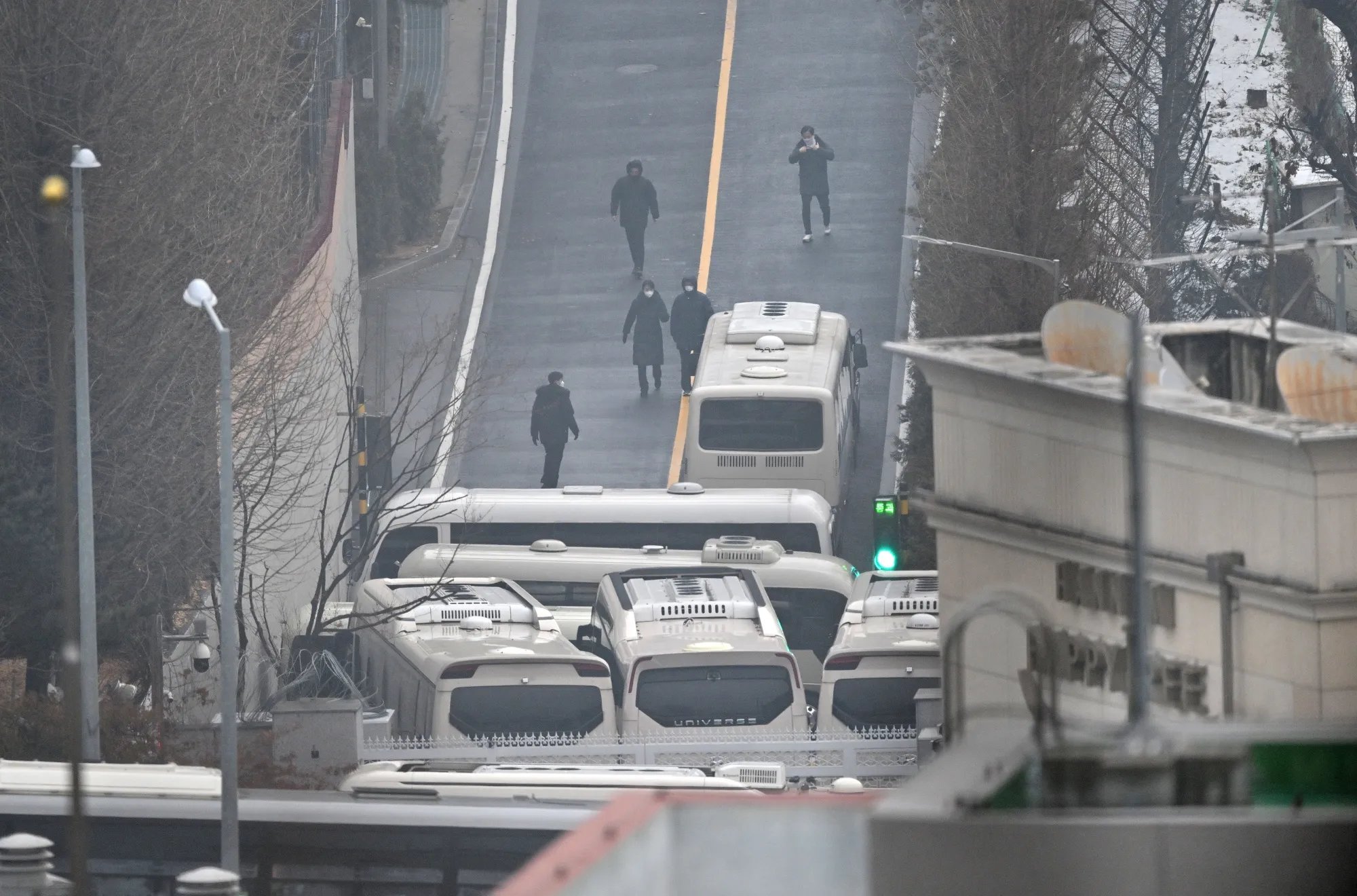 1月6日,公交车阻挡了首尔总统官邸的一个入口。摄影师:Jung Yeon-je/法新社/盖蒂图片社无论如何,尹的法律代表表示总统不会合作,并警告将采取法律行动。