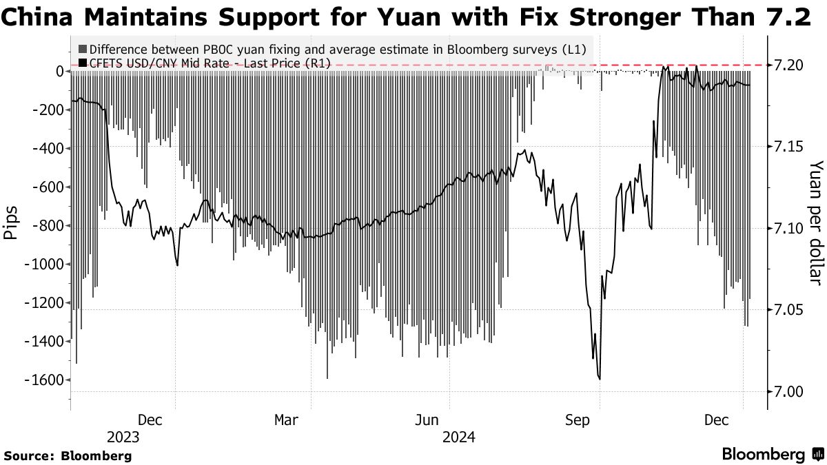 人民银行一直将基准汇率保持在每美元7.2以上,以减轻特朗普在11月美国大选胜利后美元上涨的影响。每日参考汇率限制了在岸人民币的波动幅度在2%以内,是人民银行管理货币的最常用工具。