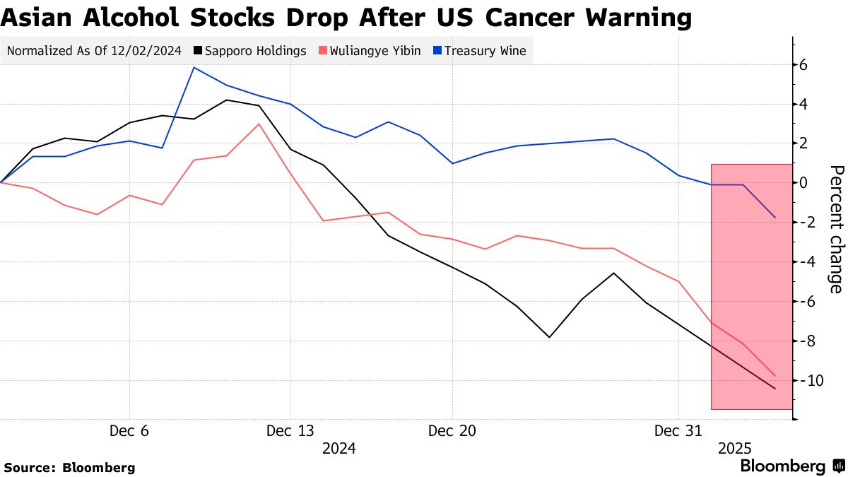亚洲酒类和啤酒制造商的股票在美国外科医生总监概述了酒精消费与癌症风险增加之间的直接联系,并呼吁贴上警告标签后下跌。
