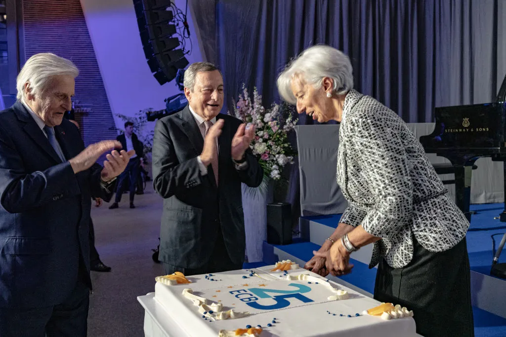 克里斯蒂娜·拉加德、马里奥·德拉吉和让-克劳德·特里谢在2023年5月庆祝欧洲中央银行成立25周年。