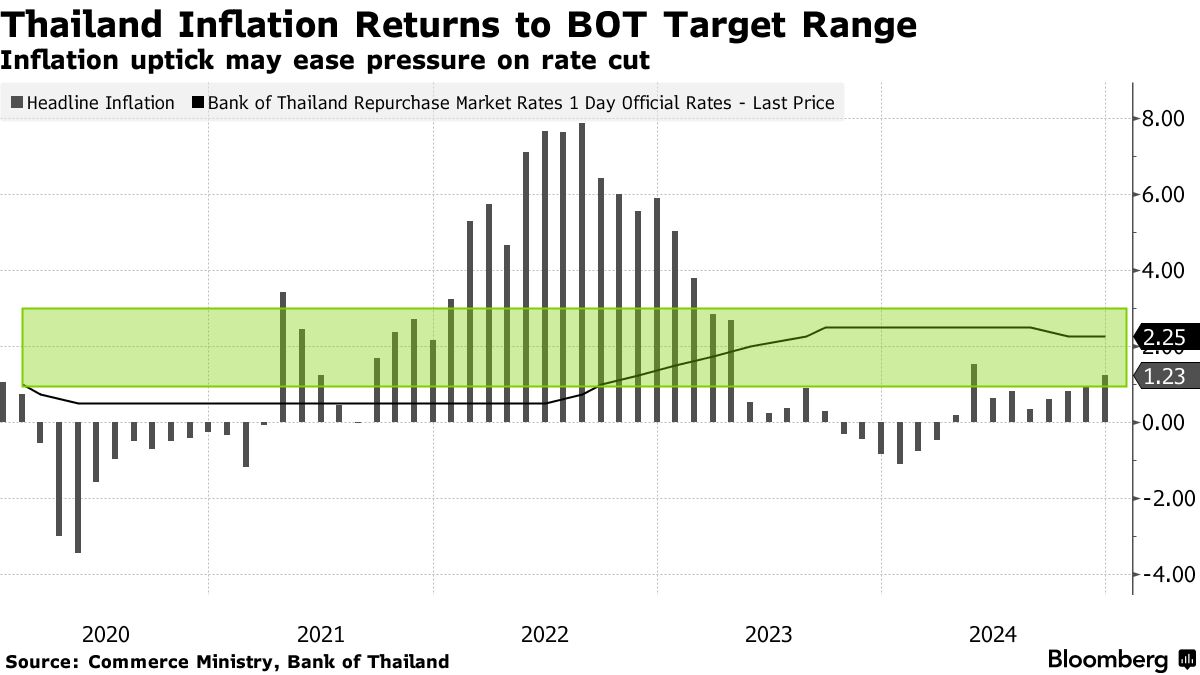 泰国的通货膨胀在七个月后首次回到中央银行的目标范围,这为货币当局提供了空间,以抵御政府对更多降息的呼吁,因为全球不确定性加剧。