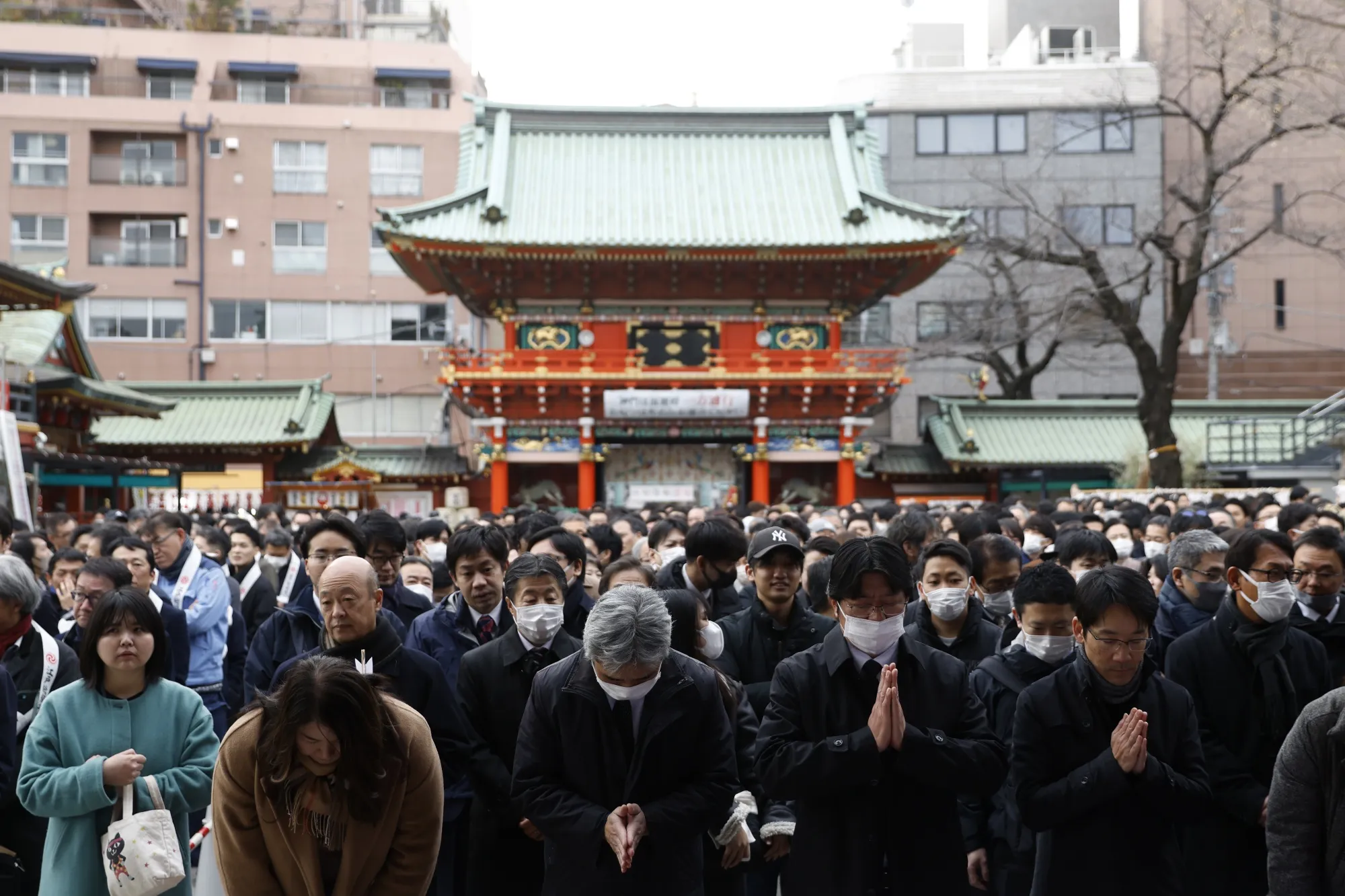 访客在东京的神田明神神社为新年的第一个交易日祈祷,日期为1月6日。