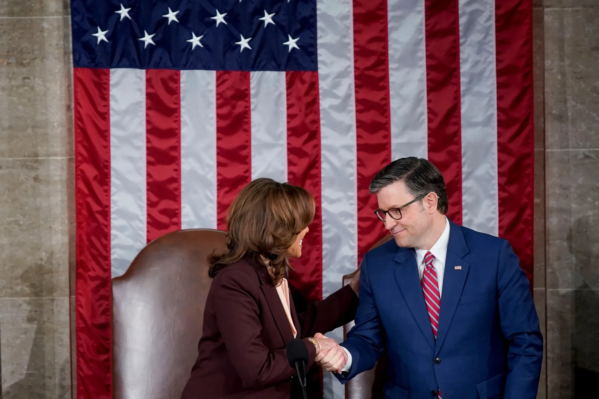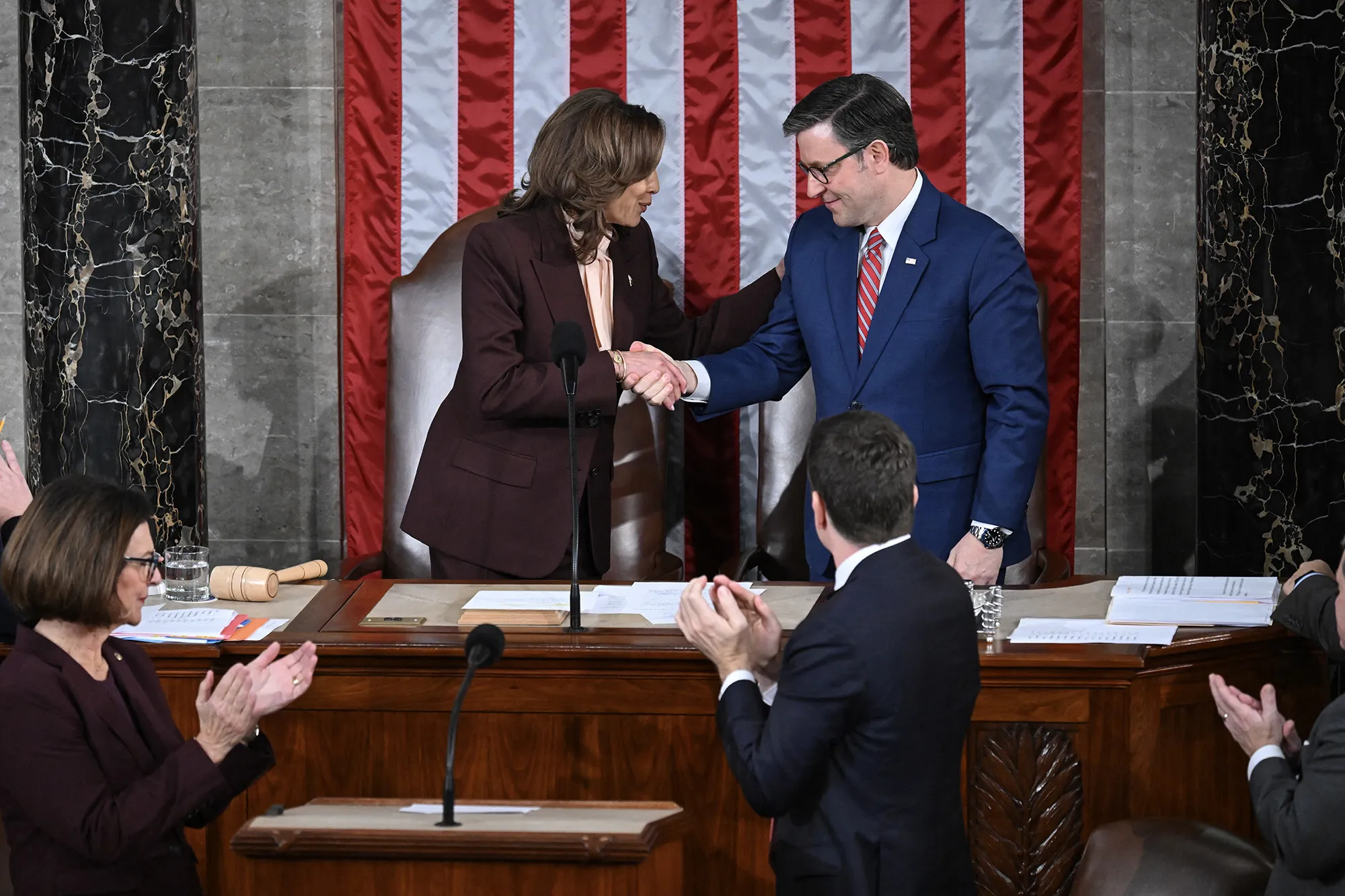 卡马拉·哈里斯在华盛顿特区国会大厦与迈克·约翰逊握手,认证2024年总统选举结果,时间是1月6日。摄影师:索尔·洛布/法新社/盖蒂图片社国会在没有争议的情况下认证了唐纳德·特朗普的总统选举胜利,败选的民主党对手卡马拉·哈里斯主持,四年前一场暴徒袭击国会的事件使投票计数受到暴力干扰,今天恢复了民主的仪式。