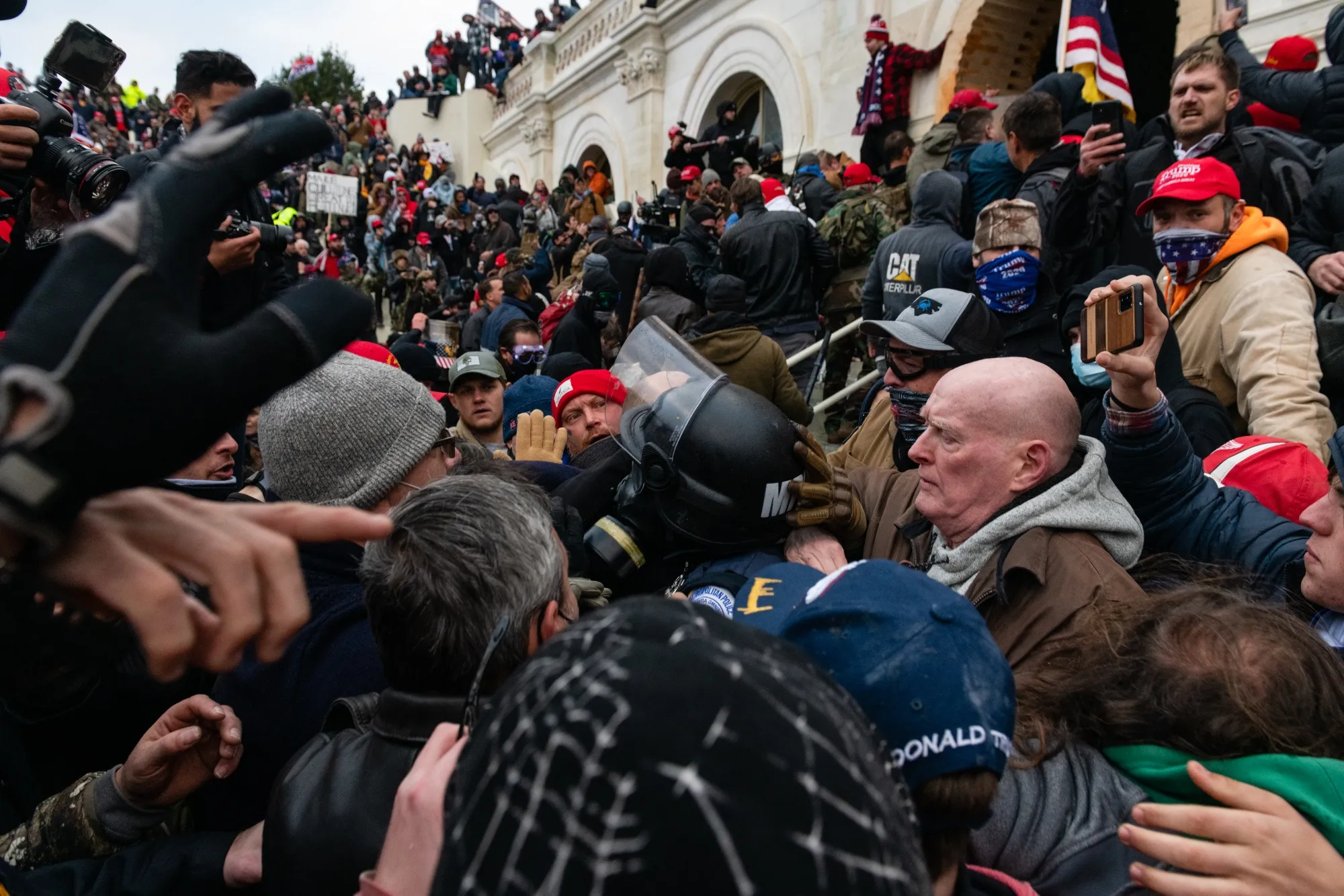 示威者在2021年1月6日的华盛顿特区抗议活动中拖拽并捕获一名大都会警察。摄影师:Eric Lee/Bloomberg执法部门在2021年暴力示威中措手不及,该示威活动干扰了拜登2020年胜利的认证。数百名特朗普支持者在听完他在白宫外的演讲后冲进美国国会大厦。在冲突中,超过140名警察受伤,其中一名在第二天中风去世,另外四名后来自杀。一名暴徒被枪击身亡。