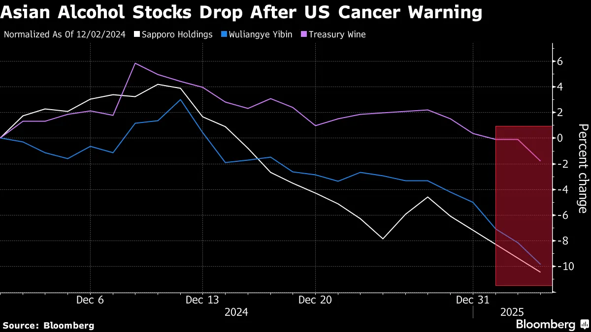 几乎所有主要经济体 — 包括澳大利亚 — 在未来一年都应该看到货币 宽松,但速度可能会放缓。彭博经济学预测,发达国家的利率综合指标在2025年将仅下降72个基点,低于2024年的降幅。新年可能标志着澳大利亚储备银行期待已久的宽松周期的开始,可能早在2月份就会开始。我们中的许多人在一月份进行健康提升,现在还有另一个理由考虑您的饮品。美国外科医生概述了饮酒与癌症风险之间的 联系,导致亚洲和澳大利亚的酒类股票下跌。Treasury Wine Estates 在这里下跌了2.7%,而百威啤酒公司亚太区在香港下跌了2.6%。
