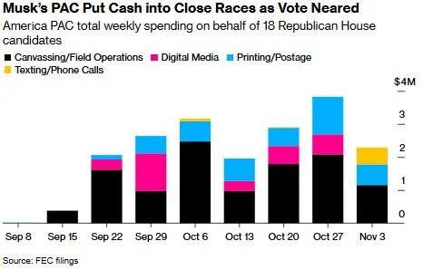 由马斯克控制的政治行动委员会在2024年选举的最后六周内花费了 $1920万美元,支持全国范围内的竞争激烈的共和党候选人。