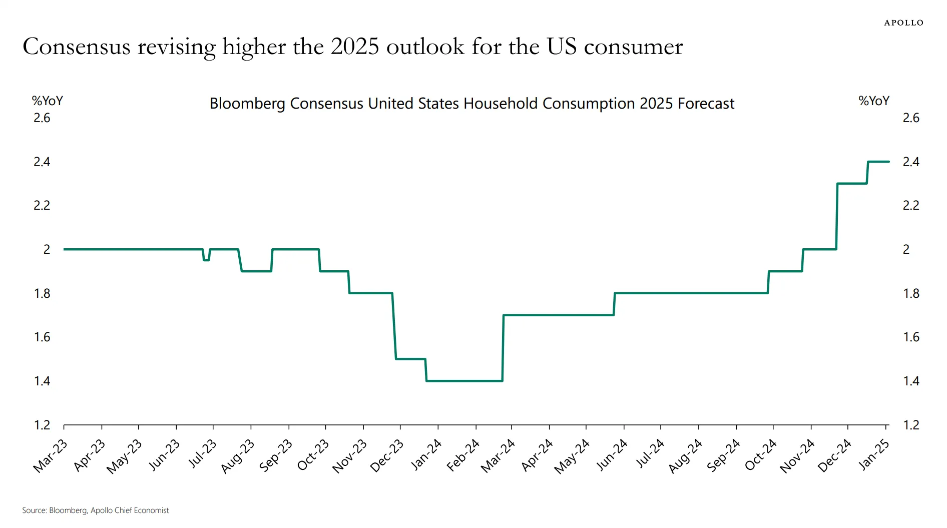staples在去年大部分时间内处于区间波动,但在美联储降息和选举改变了最后一个季度的局面之前,表现优于周期性股票。总体而言,它们在一段时间内不太可能再次表现优于其他股票。托尔斯滕·斯洛克来自阿波罗全球管理公司,他认为消费者的健康没有立即恶化。他推测,收入、股票和房价都很高,债务水平和利率敏感性都很低,银行更愿意向家庭放贷。正如他所展示的,彭博社调查的共识估计表明,华尔街与他看法一致,自选消费家庭支出预测自选举以来已多次上调: