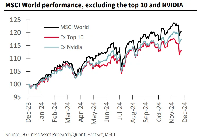 为了强调我们在新的一年里对少数主导平台集团(以英伟达为首)的不安依赖,这里是拉普索恩的另一张图表,显示了如果没有其10只最大股票,以及仅没有英伟达,MSCI世界(包括1400家公司)将会如何表现: