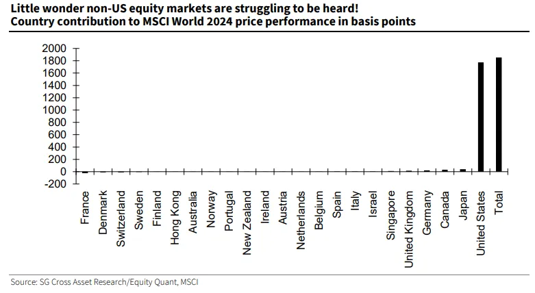 对今年市场的判断仍然依赖于预测少数几只万亿市值股票的命运。为了说明去年全球回报变得多么失衡,这里有一张来自法国外贸银行首席量化策略师安德鲁·拉普索恩的图表,让我忍俊不禁。它显示了去年MSCI世界指数上涨的点数中可以归因于每个成员国的数量: