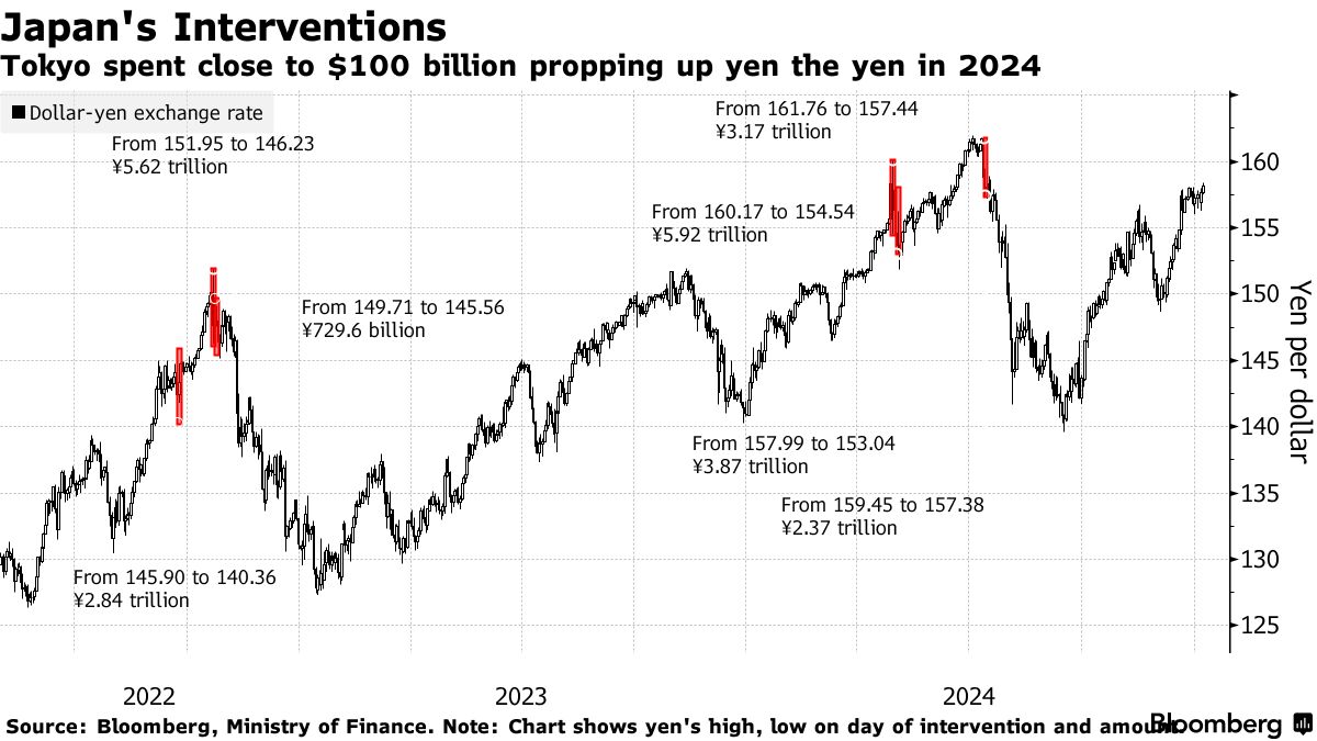 日本在2024年四次进入货币市场,花费近1000亿美元来支撑日元。最后两次干预发生在七月,当时日元兑美元突破160的门槛。