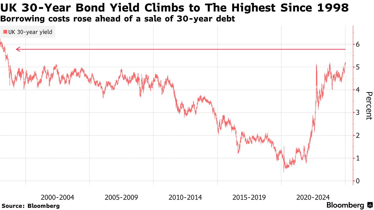 英国30年期国债收益率攀升至1998年以来的最高水平 - 彭博社