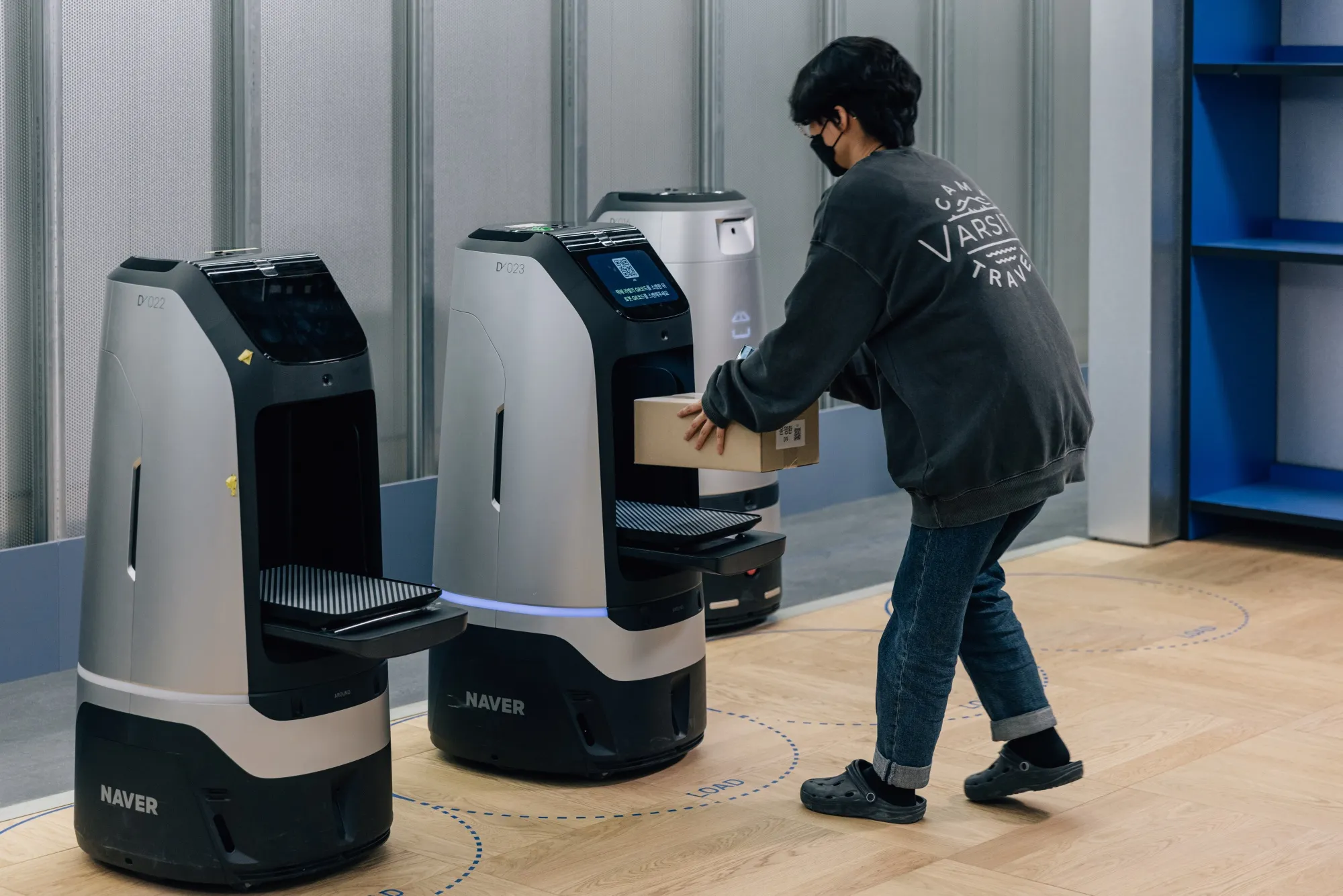 沿着指定路线缓慢滑行,这些机器无处不在,它们的运动由Naver Cloud上的控制系统提供动力,该系统构建了设施的全面数字地图,以防止机器人碰撞。