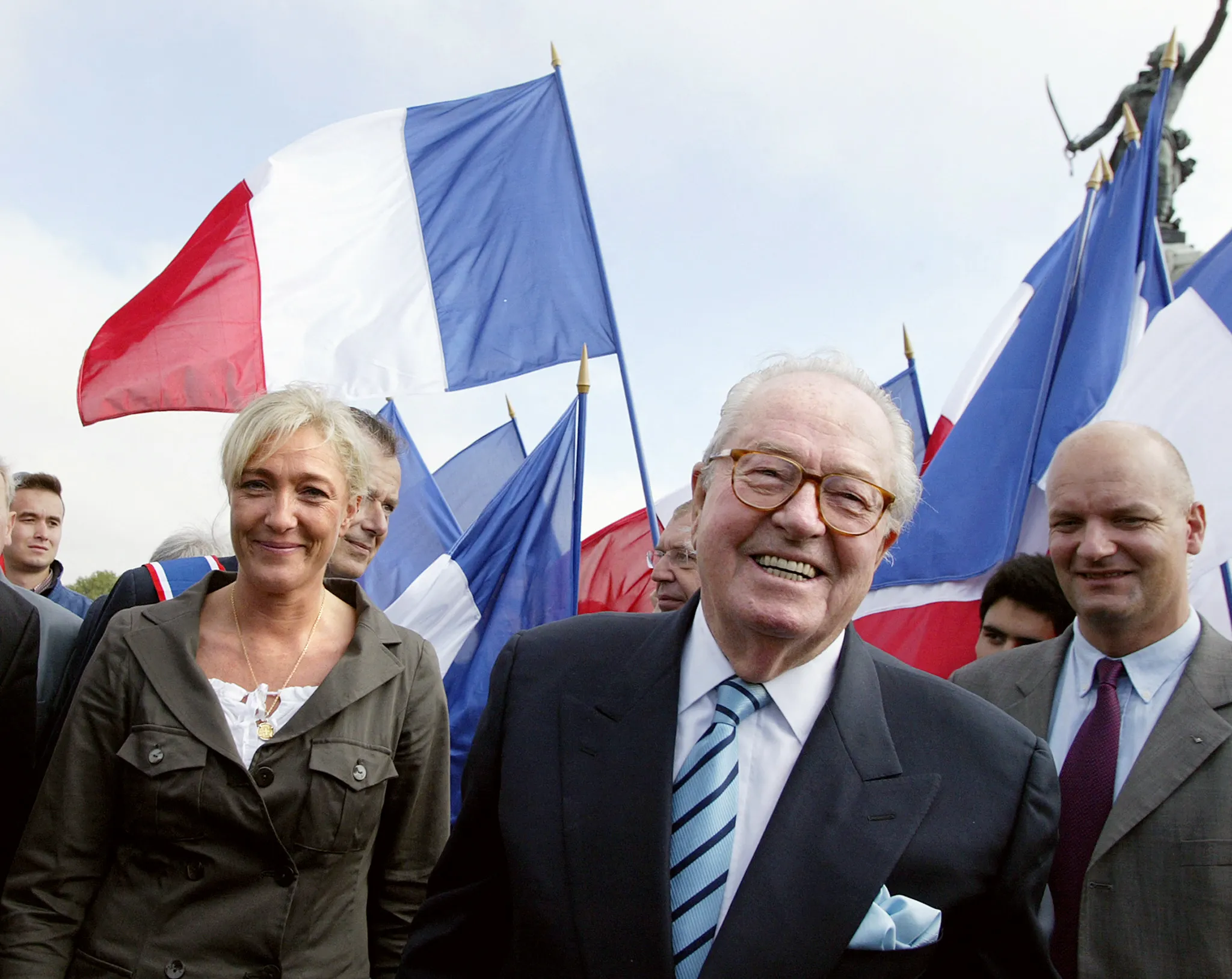 让-玛丽·勒庞和他的女儿玛丽娜·勒庞于2006年访问法国东部1792年瓦尔米战役的历史遗址。摄影师:阿兰·朱利安/法新社/盖蒂图片社玛丽娜,1968年出生,试图彻底改革党的形象,抛弃任何反犹太主义的暗示,专注于经济和社会问题。让-玛丽对女儿对党的改变感到不满,并在2015年因她拒绝称呼战时合作领袖菲利普·佩坦为叛徒而将他驱逐出党。